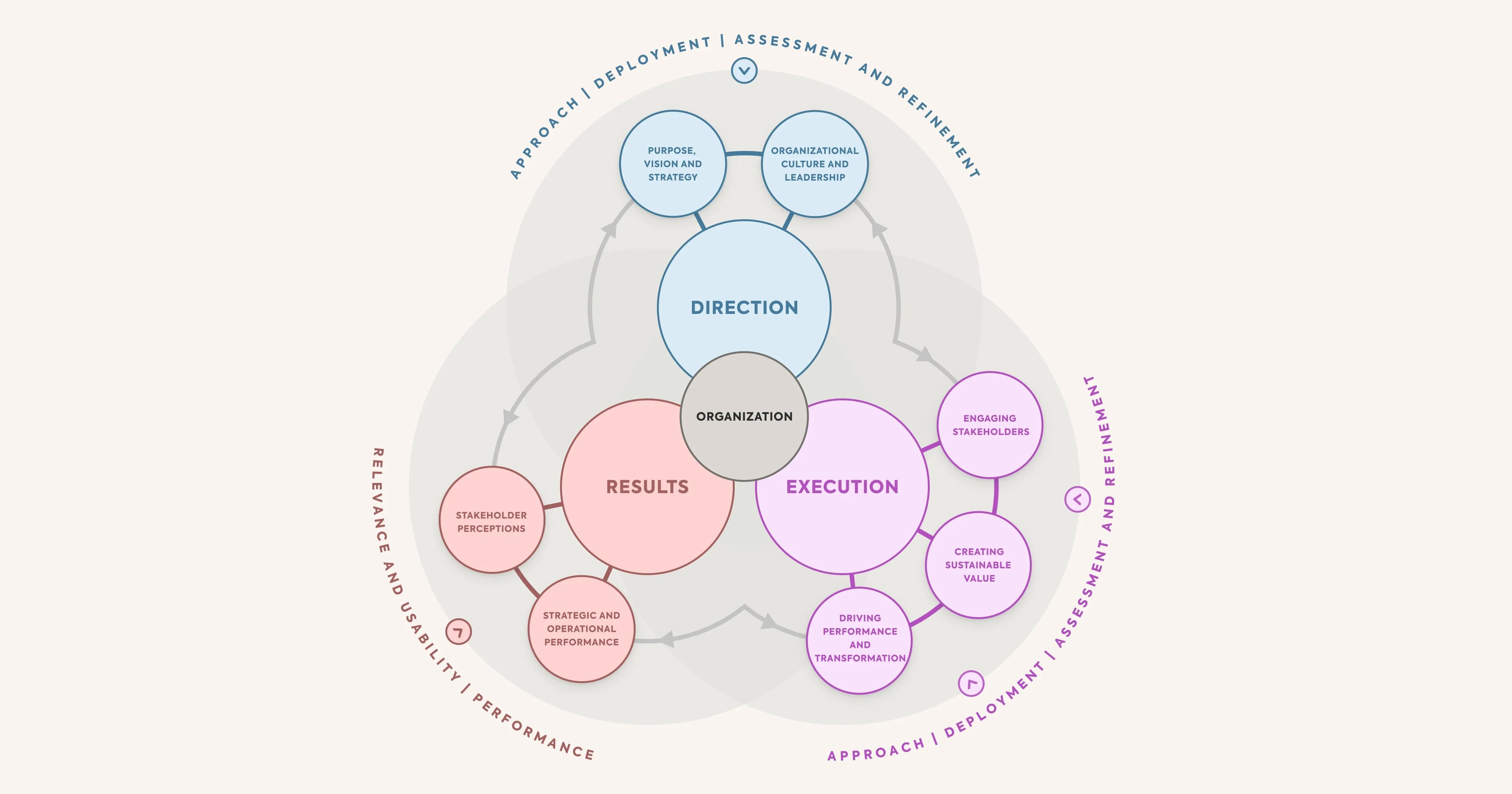 The model thus links an organization's purpose, vision, and strategy (why) to the benefits it creates for its stakeholders (how) and sustainable excellence in results (what).