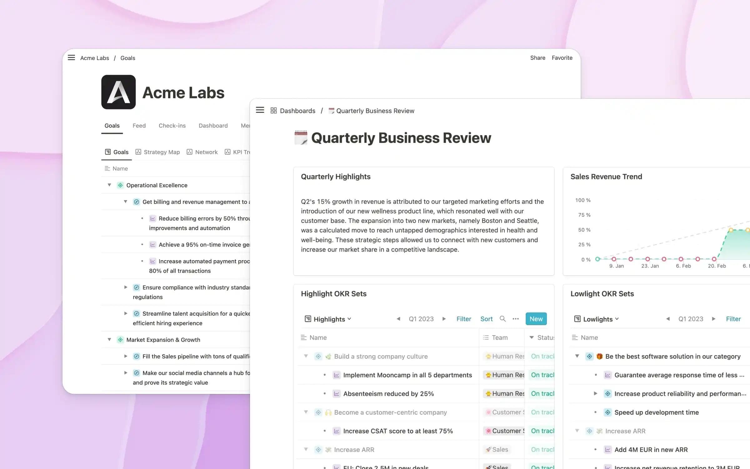 - Shared goal-setting: Enables the creation and tracking of shared OKRs, which can be accessed by different teams to ensure alignment on company-wide goals.