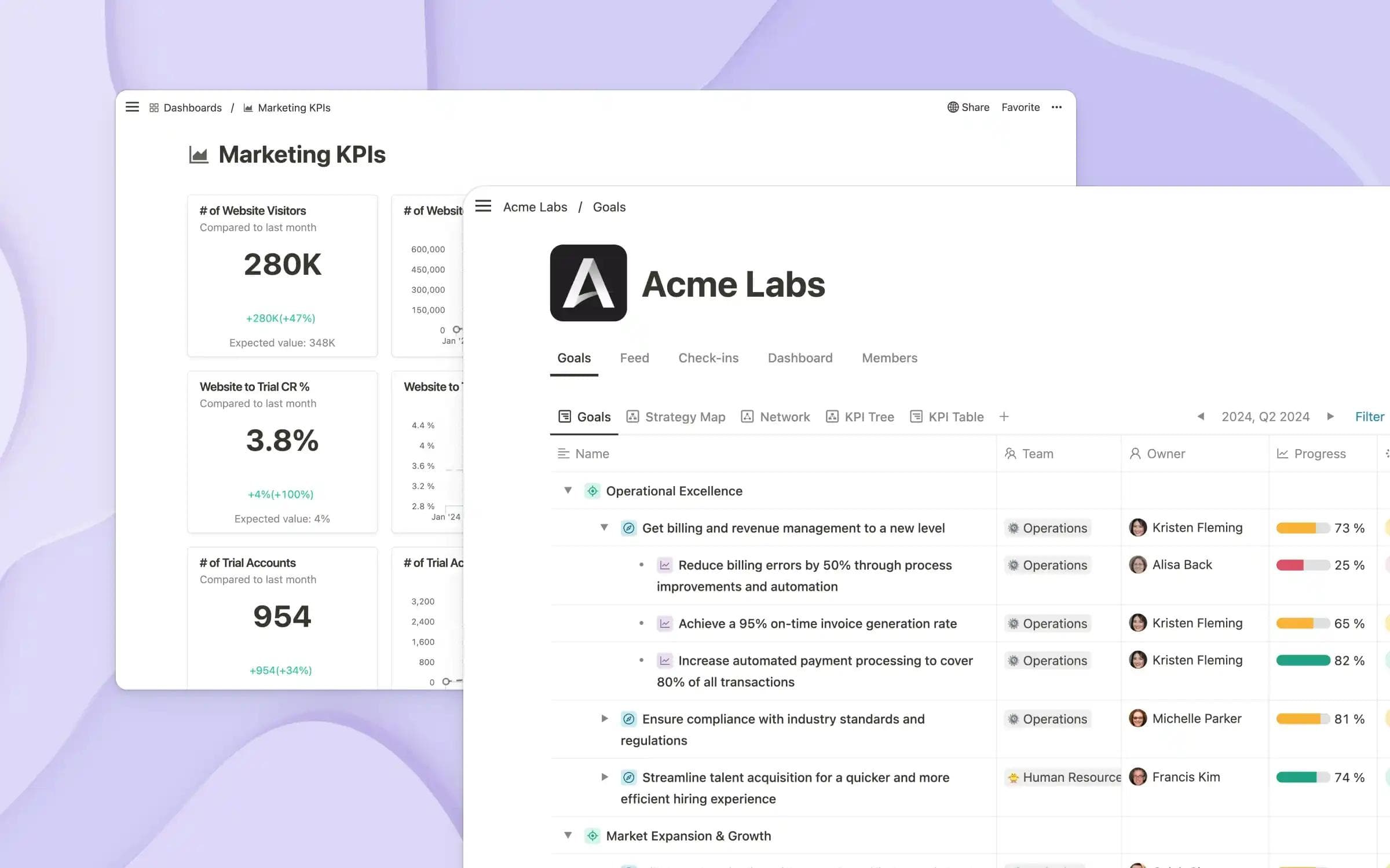 - Collaborative dashboards: Provides shared dashboards that allow teams to view and manage goals collectively, fostering a sense of community and shared purpose.