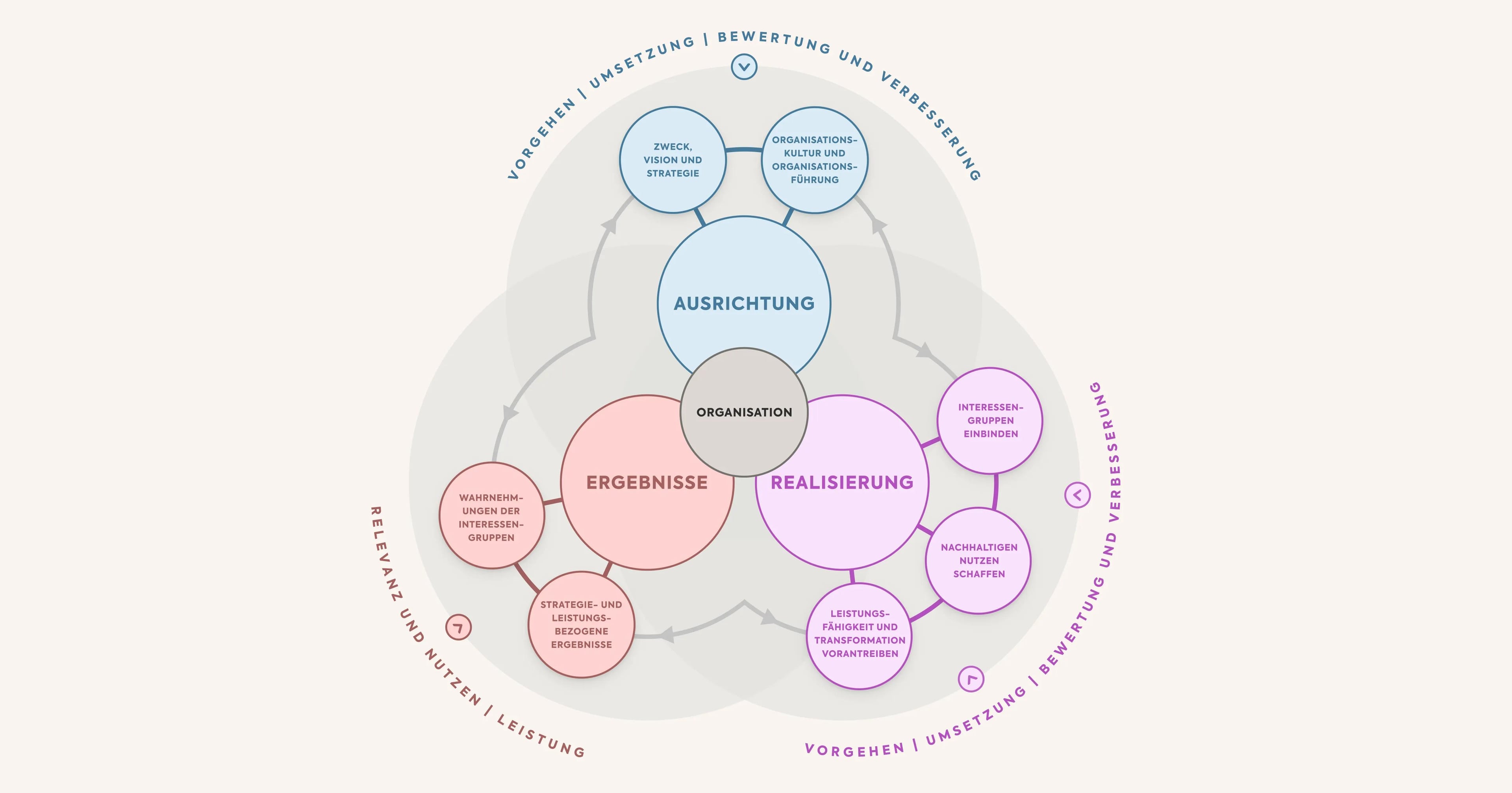 Das Modell verknüpft also den Zweck, die Vision und die Strategie einer Organisation (Warum), mit dem Nutzen, den diese für ihre Stakeholder schafft (Wie), und exzellenten Ergebnissen (Was).